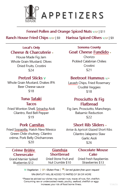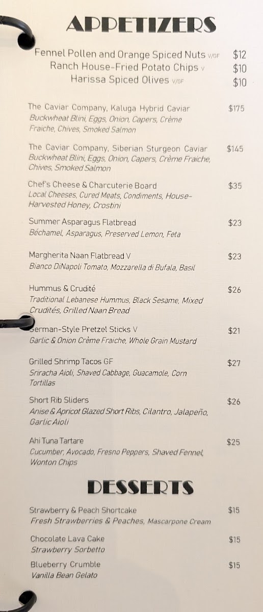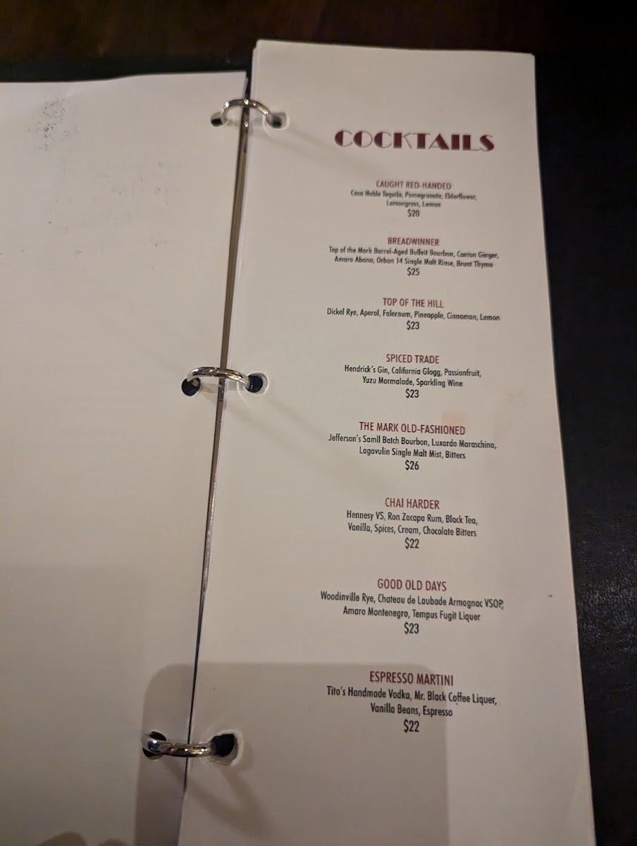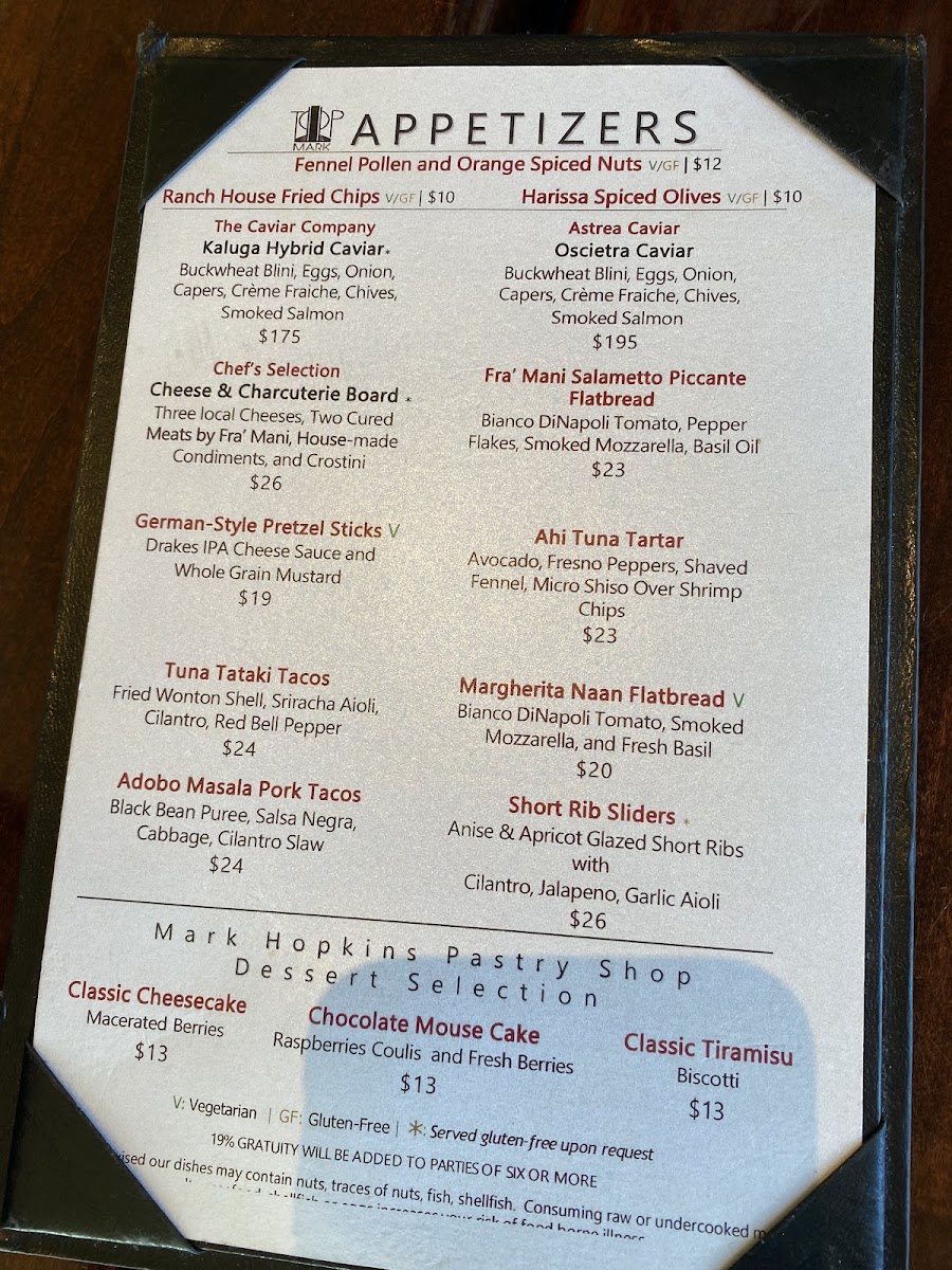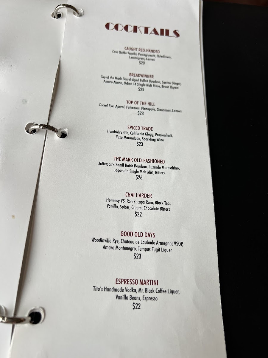 Top of the Mark’s menu caters to a variety of tastes, featuring sumptuous appetizers and a well-curated selection of spirits and wines. Indulge in the delightful dessert offerings such as the Apple Tarte Tatin served with creamy vanilla bean gelato, or the decadent Chocolate Lava Cake paired with bright berry gelato—both for just $15. The charcuterie board, ample and flavorful, is a favorite among guests, making it an ideal shareable to accompany your drinks.